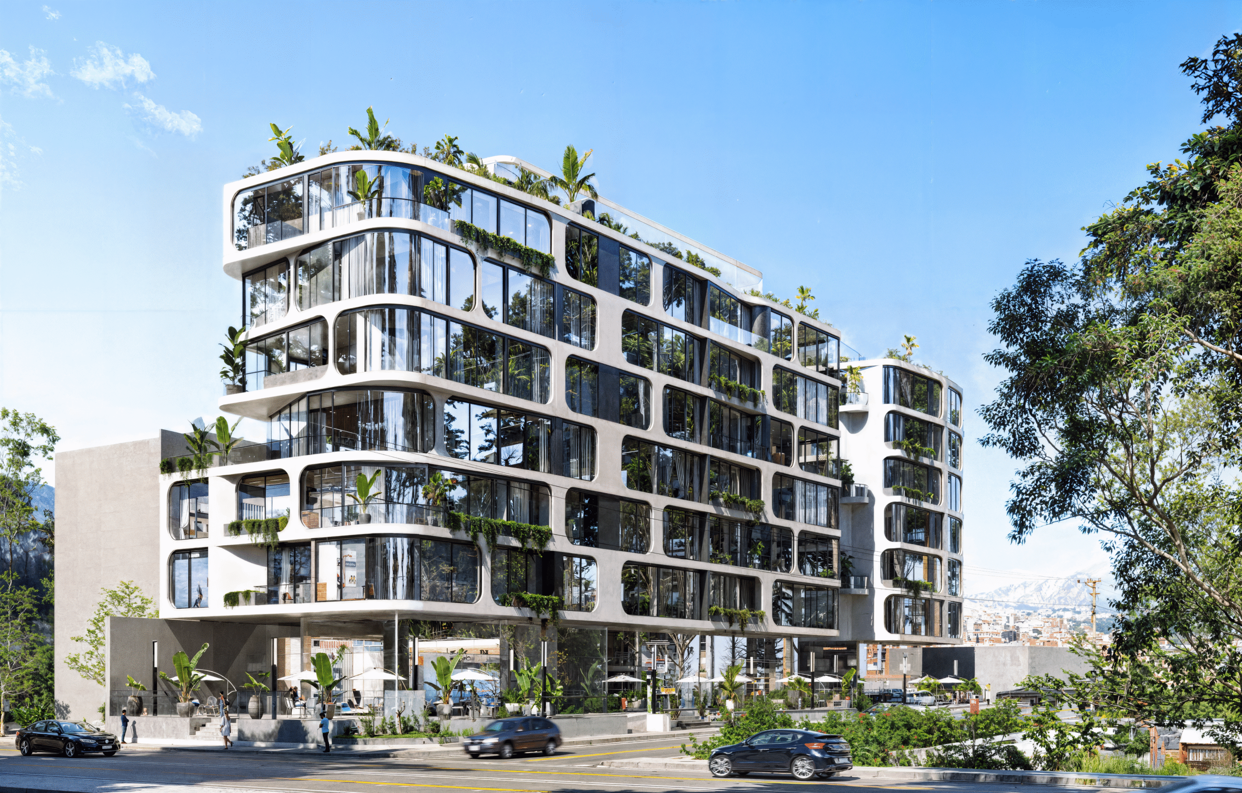 Distrito 3-55 rompe con lo tradicional mediante un lenguaje visual de curvas y fluidez que se aleja de las estructuras rígidas. El proyecto se define por dos torres hermanas que, aunque comparten un ADN estético de modernidad y luz, ofrecen ambientes especializados para sus residentes, integrando la vegetación como un elemento constructivo más.
